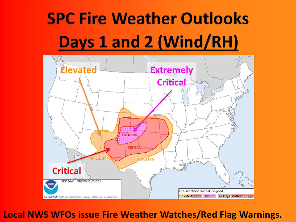 For local Red Flag Warning alerts, meteorologists look at forecasted temperature, incoming and outgoing storm systems (high- and low-pressure systems) with their potential for wind, the likelihood of wet or dry lightning, the dryness of fuels based on recent precipitation and season, and how local terrain will interact with wind and potential ignitions (YouTube: Forecasting Fire Weather in the US). Local forecasts also inform the national NWS Fire Weather Outlook forecast by contributing to fire weather composite maps and short-wave ensemble forecasts.