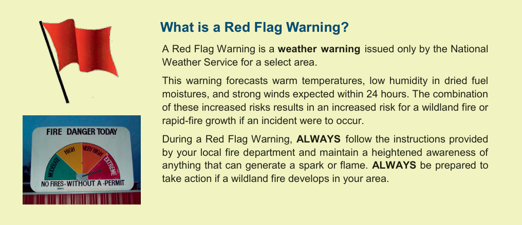 According to the National Weather Service (NWS), which issues these alerts in conjunction with local and state agencies, a Red Flag Warning is part of a weather forecast which indicates a local increase in fire danger risk in the next 12 to 24 hours. This increased risk is due to a combination of critical fuel conditions and critical weather conditions (warm temperatures, very low humidities, and strong winds). This means that if a wildfire starts, the conditions are right for it to spread rapidly and be difficult to contain. Red Flag Warnings differ in timing from a fire weather watch, which is a longer-term forecast that warns of the possible development of Red Flag conditions in the next 72 hours.