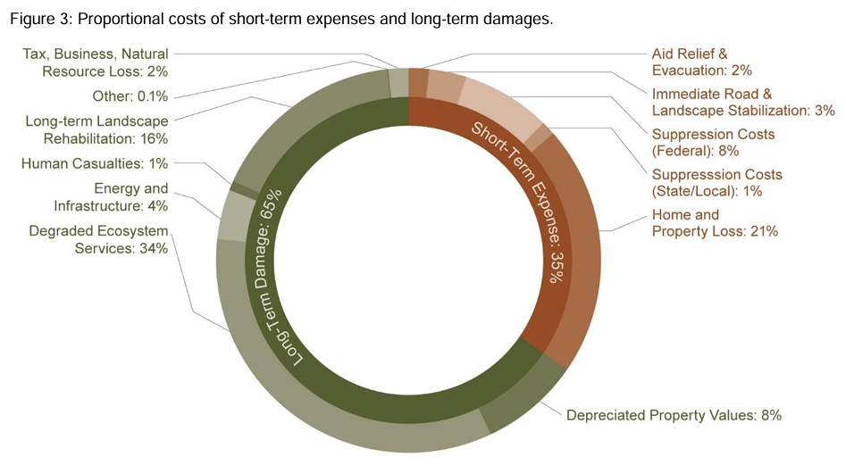 “Full cost accounting after wildfires is critical for adequate government budgeting, post-wildfire resource allocation such as disaster recovery assistance and understanding the full scope of wildfire to help communities learn to better live with fire” (Hjerpe et el., 2023). For a good overview of the complexity of full cost accounting, view this blog from the Council of Western State Foresters.