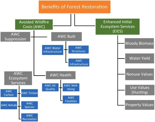 While there are examples of full cost accounting for fires in the West (see “Case Studies”, pages 7-16), the practice is still comparatively rare because of the difficulty obtaining the relevant data. A recent remeasure of the full cost of the 2010 Schultz Fire in Arizona, while illuminating the longevity of post-fire impacts and expenses, was still conservative as it did not account for every potential direct and indirect ‘net value change’ (e.g. non-mortality related impacts to physical and mental health). The authors write “given the trends of increasing wildfire severity and duration of fire seasons, combined with… myriad costs of wildfire, it is safe to assume the full costs of wildfire are vastly underrepresented and enormous. Additionally, as the Schultz Fire example demonstrates, a single fire often has many costs that are difficult to quantify and are temporally dispersed, such as costs to ecosystem services or community well-being. This further emphasizes the importance of proactive fuel treatments and forest restoration work to reduce the risk of uncharacteristic fire and restore ecosystem health… Millions of dollars may have been saved by forest restoration treatments in key parts of the Schultz Fire perimeter before the fire.”