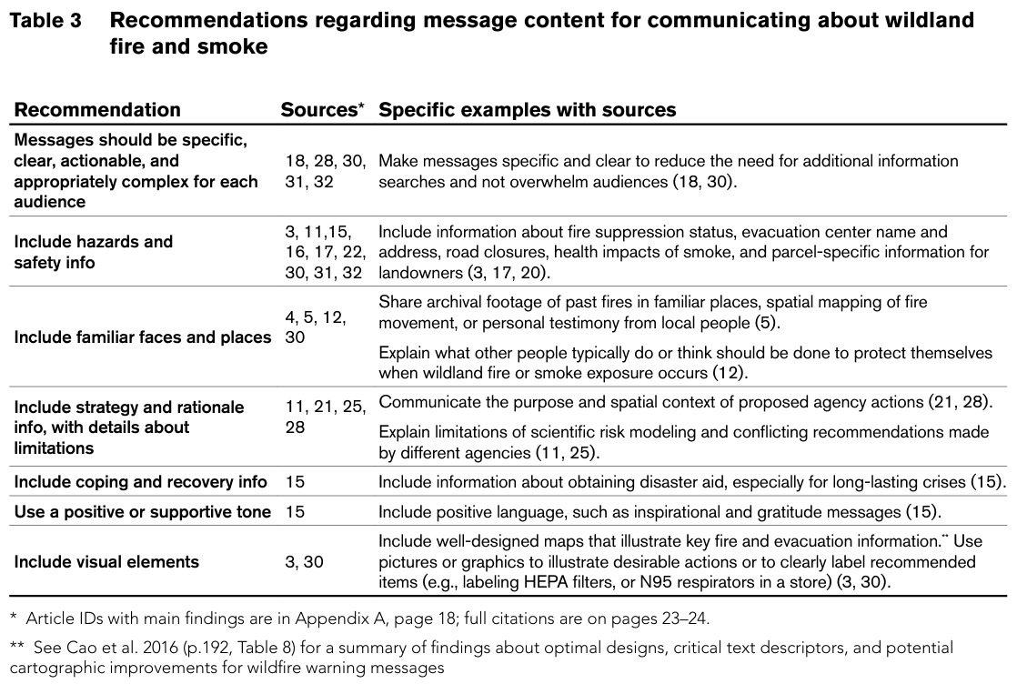 Further reinforcing these findings, the Northwest Fire Science Consortium published a 2021 literature review on communicating with the public about wildland fire preparation, response, and recovery. The authors identified seven recommendations related to message content that communicators should include when engaging the public; the four particularly relevant to risk communication are highlighted below: