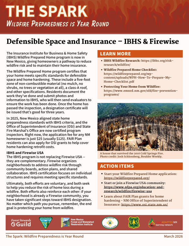 The Spark: Wildfire Preparedness is Year-Round is a unified, statewide messaging campaign that promotes year-round wildfire preparedness through consistent and coordinated outreach each month. It is produced by a core group of partners, including FACNM, BLM–New Mexico, NM State Forestry Division, USDA Forest Service Southwestern Region, Forest Stewards Guild, and the New Mexico Forest and Watershed Restoration Institute (NMFWRI).