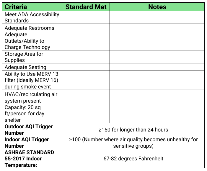 The following image includes criteria that the Montana Department of Public Health and Human Services (DPHHS) has in their Clean Air Center Resource Guide to consider when selecting a site to set up a clean air center: