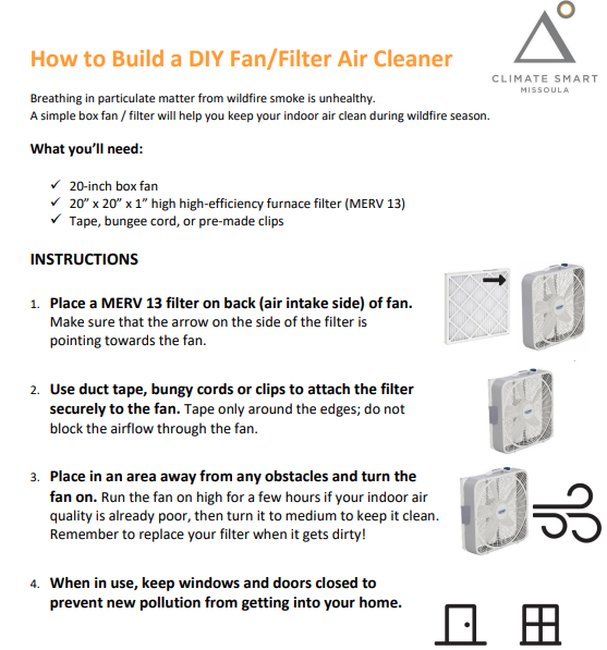 Additionally, upgrade the filter efficiency of the heating, ventilating, and air-conditioning (HVAC) system. Use the highest filter your system can handle. A MERV 13 or higher filter is best, but MERV 11 and 12 will still help clean indoor air. Also, keep extra filters on hand and changing filters frequently as they get dirty during smoke events greatly improves indoor air quality. If your air systems cannot use a better filter, use portable air cleaners or DIY filter to clean individual rooms.
